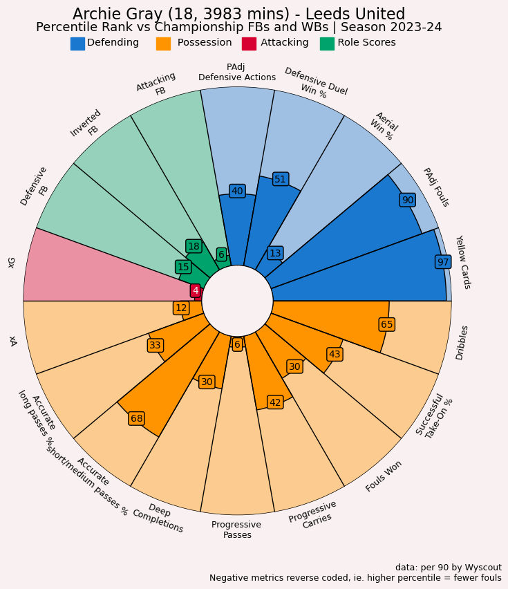 Nevertheless — as you’ll see below — the work of “slotting in” doesn’t necessarily do wonders for his numbers. Despite clearly passing the eye test, it’s interesting that he doesn’t score that well when it comes to the data. But you have to keep in mind that Gray, a teenager in his first full season, made the 13th most tackles in the league for a defence that kept the most clean sheets playing as full-back, which is not his natural position.