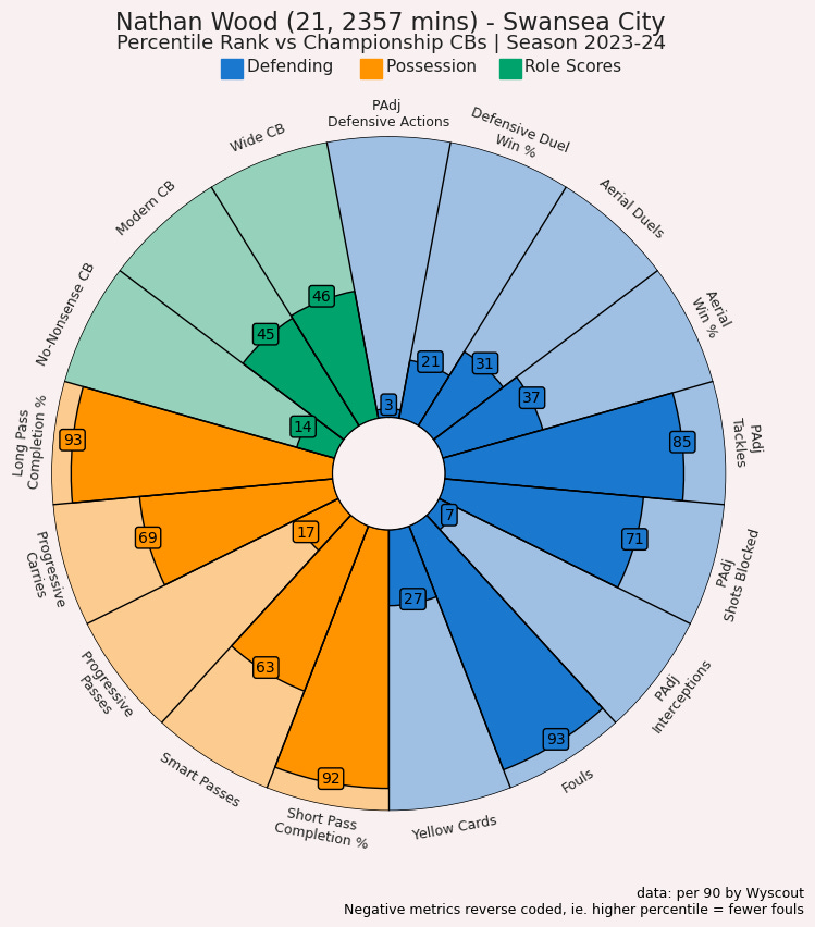Wood, still 21 when the season ended, is one of very few defenders aged 21 or under who played 2,000+ minutes of the 2023/24 Championship campaign – despite the Swansea man missing three months when he required surgery for an ankle injury. It didn’t slow him down… but not much does, when you’ve run 100m in 13 seconds before.
