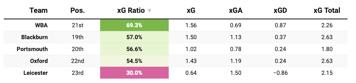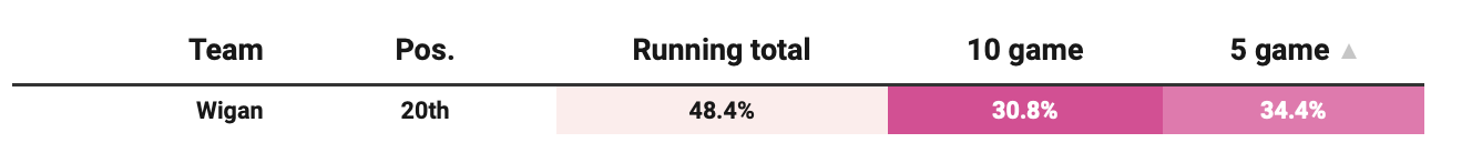 However, the underlying numbers are less emphatic. Wigan’s xG share shows only slight improvement, suggesting results may be running ahead of process — “may” being the key word there.