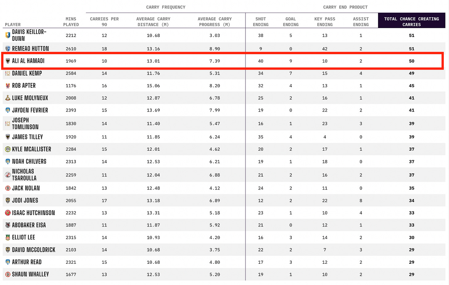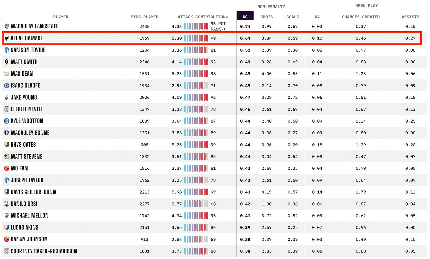 Our friends at Scouted are lucky to have access to SkillCorner physical data that’s off-limits for most mere mortals outside of football clubs. And, sure enough, Al-Hamadi’s physical data projects favourably with Championship level, which has to be a good sign. The savviest Championship clubs will have access to this data, and it will hold a lot of sway.