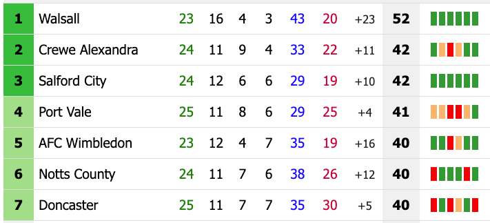 🤏 Brought Don to size — Doncaster 1-2 Port Vale — Just below Salford are the huddled masses yearning to breathe free. Leaving aside Walsall, now 10 (!) points clear of 2nd with a game in hand, the whole of League Two’s top 7 are separated by two points. That’s because Port Vale remembered where the goal is just in time for their visit to Doncaster; having not scored twice in a game since October, finding the net just four times in 10 matches since then, they converted two of their five shots at the Keepmoat and won, thanks to a combination of Antwoine Hackford, Ryan Croasdale, Lorent Tolaj and Ben Amos. Donny, who could’ve moved into 2nd, instead sit down in 7th. What a league.