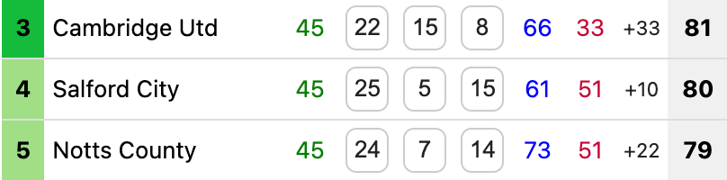 Salford’s Thursday-night victory moved them up to 3rd, only for Cambridge to reclaim the final automatic promotion spot by beating Barrow 3-0. James Gibbons scored the pick of the goals for the U’s, who kept their 19th clean sheet of the season – the most in League Two. Notts County ensured it’ll be a three-way fight for 3rd on final day, as Nick Tsaroulla’s goal steered them to victory over Colchester.