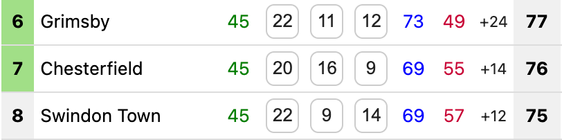 A Jaze Kabia-inspired Grimsby shot up to 6th with a 4-0 victory over Ian Holloway’s Swindon, who slipped out of the top seven altogether after Chesterfield’s 2-0 win at home to Crewe. Kabia’s first EFL hat-trick took him to 18 league goals for the season, second only to Aaron Drinan (22) in the Golden Boot stakes. Grimsby go to Tranmere next weekend, while Swindon host Chesterfield. Tasty.