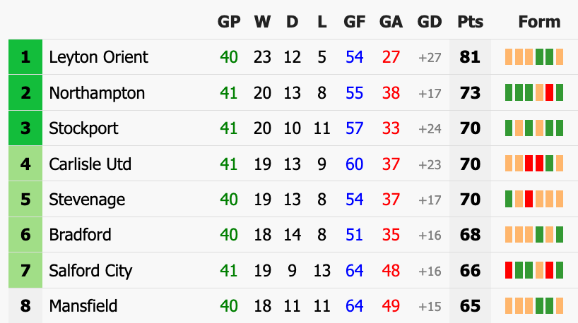 As Carlisle jockey for position, itâs notable that theyâve only scored in one of their last six games. They havenât conceded many, so whilst it has cost them a place in the promotion spots, it hasnât cost them too much in the way of points. They took four points out of six over the Easter weekend, but I donât think that was the nerve-banishing return that Carlisle fans were hoping for.