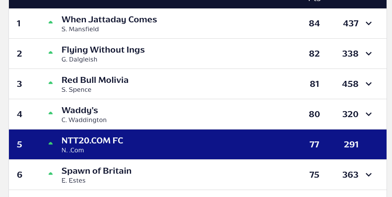 Finally, a haul that puts us right up there for the game week total: fifth overall, no less! There’s a long climb ahead. But we’re going to have a good crack at it. Well done to When Jattaday Comes for most points this week, and to the NTT20 League Leader, Red Bull Molivia.