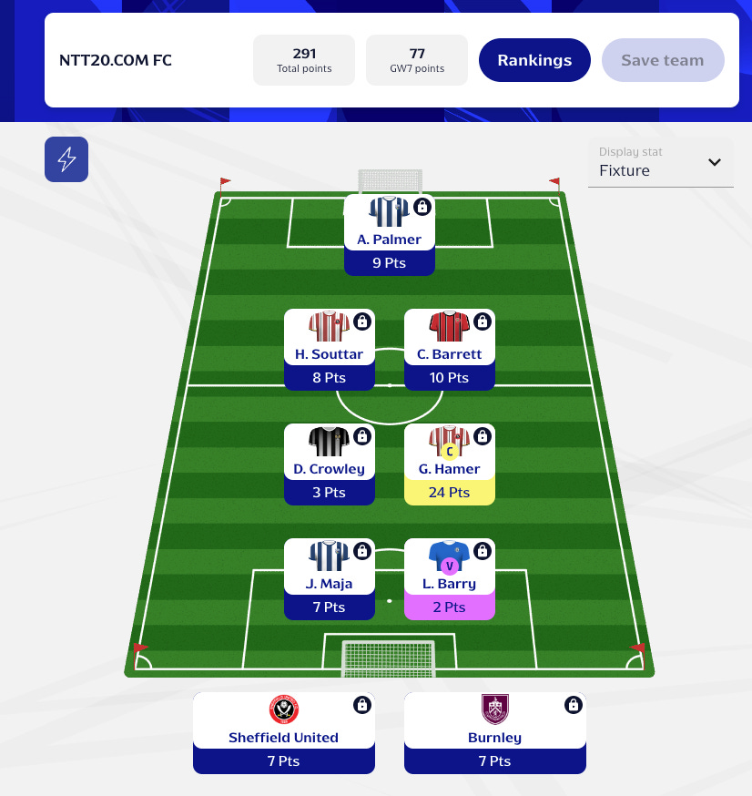 We’ve struggled to put a marker down this season. The managerial chop and change is no excuse. This week, Sam’s gone at it like this: pick a player under 0.1% ownership* (Harry Souttar – how?) and build the rest around in-form teams and players. It can be a simple game.