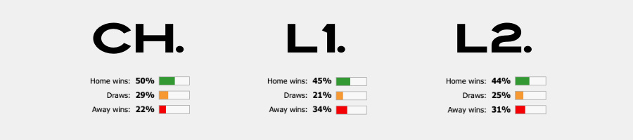 📊 Win dispersion — At the time of writing, the home team has won 50% of the time in the Championship; it becomes less likely as you go down the leagues, but what’s that? League One: the king of the no-draw.