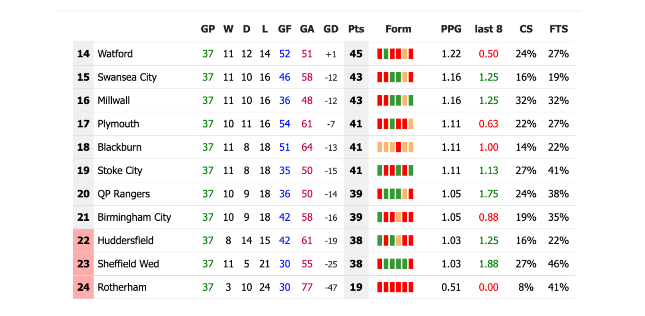 Despite suffering back-to-back defeats, Huddersfield fans have seen enough in Breitenreiter’s first four games in charge (and Worthington’s spell in temporary charge) to suggest that the Terriers have enough about them. The underlying performance data over the last few months is impressive. Town still have to play five fellow relegation candidates – including a massive game against Rotherham on Saturday. Also, Huddersfield may be lacking Championship experience in the dugout, but many of the current squad were part of Neil Warnock’s side who successfully fought off relegation last season.
