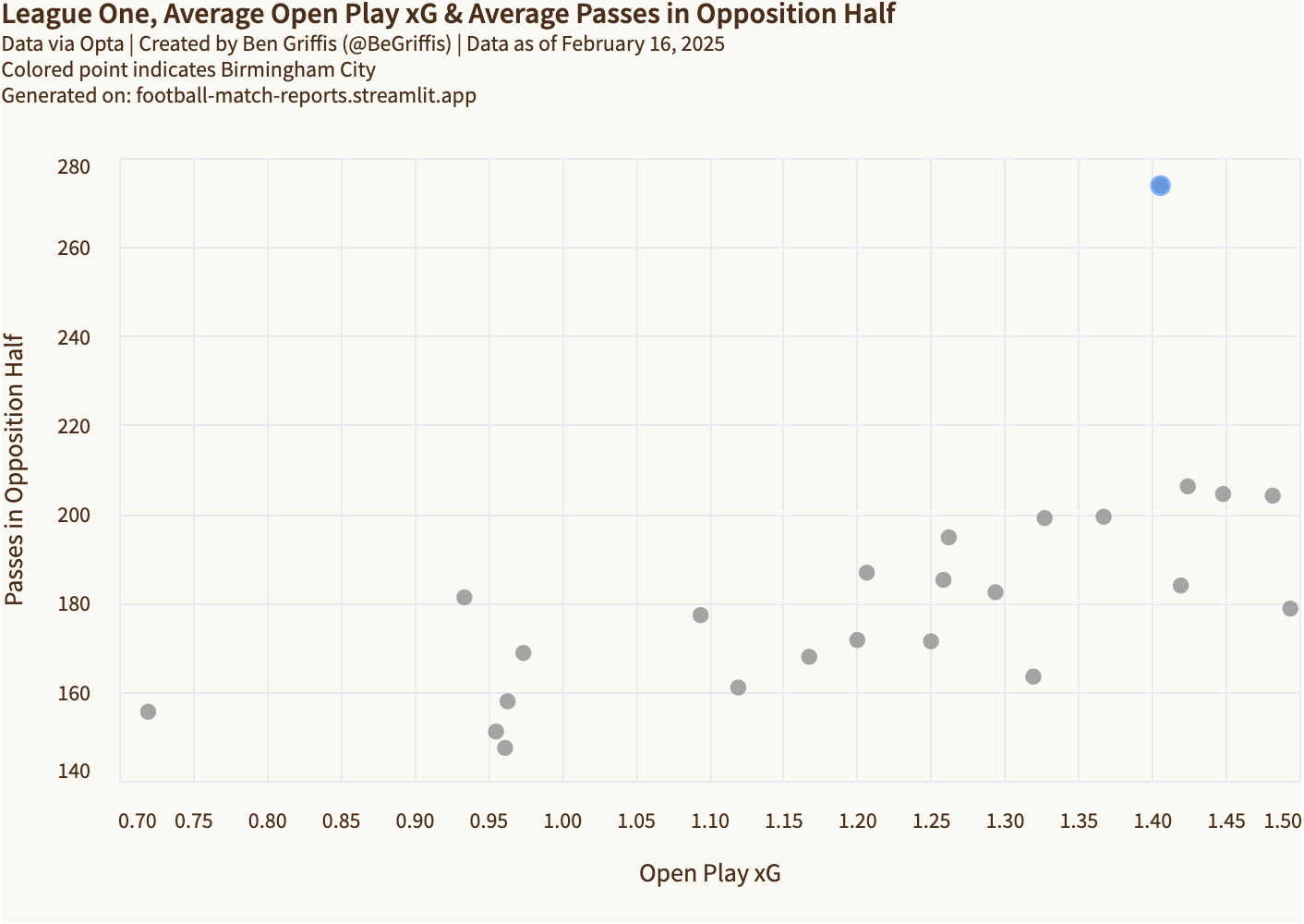 Statistically, Birmingham’s ball domination this season borders on comical. With 65.8% possession, they average 10% more than even the next-most possession-based team (Bolton, second on 55.6%). Davies’ side therefore have the opportunity to do more with the ball, because on average they have it in their control for nearly 10 minutes more ball-in-play time than any other League One team.