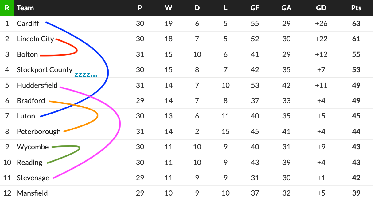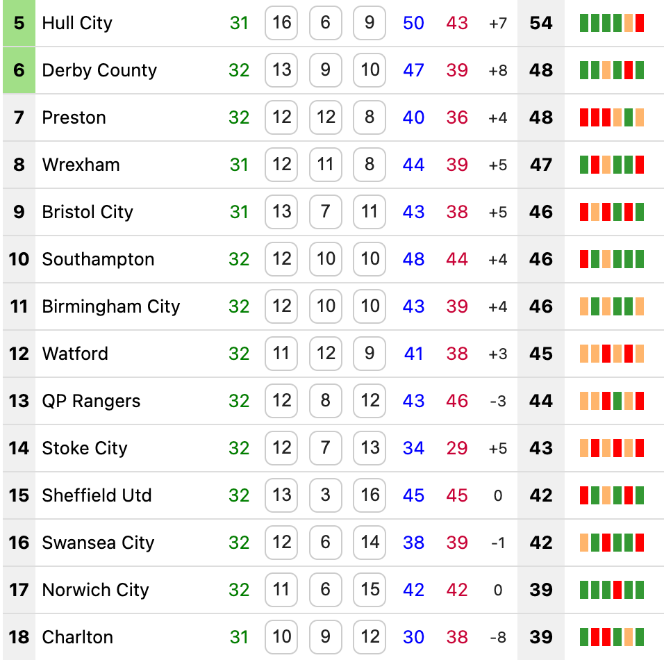 It’s Derby’s turn to occupy 6th, following a 2-0 victory at Pride Park. Swansea had most of the ball but Derby made the most of their corners, with Rhian Brewster and Patrick Agyemang on hand to convert. Swans would’ve drawn level with their opponents if they’d won, but instead 10 places separate them, which is COMPLETELY RIDICULOUS. Does that mean Sheffield United, in 15th, are still in the play-off conversation due to their last-minute winner at a profligate Portsmouth? Maybe! They, and Swansea, sit six points off 6th.