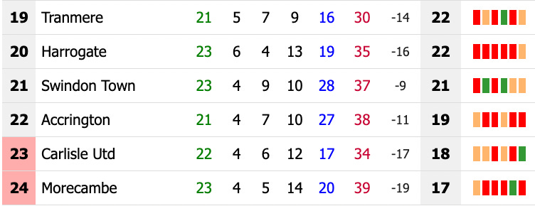 🍃 The lowest branch — Tranmere (19th), Harrogate (20th), Swindon (21st), Accrington (22nd), Carlisle (23rd), Morecambe (24th)