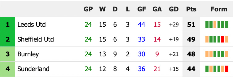 🎄 Top of the tree — Leeds (1st), Sheffield United (2nd), Burnley (3rd) Sunderland 4th — Blades lost their spot at the top of the tree with a Boxing Day defeat to Burnley. Perhaps bigger than the result, they lost centre-back Harry Souttar for the season with an Achilles injury. Their position remains solid after a 1-1 draw with WBA, but Wilder will be desperate for reinforcements from the new owners after fielding a bench of mostly development players.