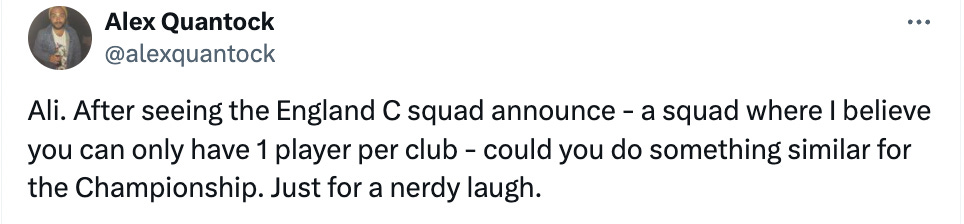 I am going to select a 24-man squad from all three EFL divisions. Three goalkeepers are compulsory. The rest is up to me, except for one strict rule: in keeping with the squad selection philosophy of England C, I can only select one player per club.
