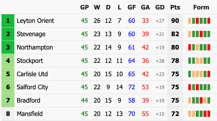 As for Northampton, the ghost of last season, when they lost their automatic spot on Final Day due to Bristol Rovers’ five-goal swing, looms large. It’s worth remembering that they did their bit that day, beating Barrow 3-1. Get it done against Tranmere and there’ll be no worries about other scorelines. Fail to win, and Stockport (or Bradford) could chase them down. Nervy.