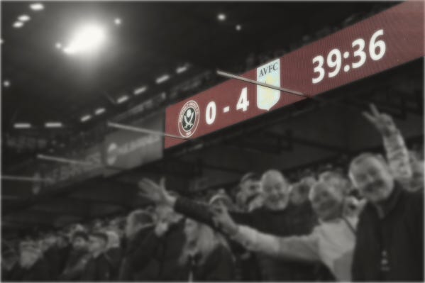 It was hoodies and trainers for me on February 3rd, 2024. At around 6pm I stood up, shuffled along my row, headed down the gangway and left Bramall Lane. The pub was a short walk away. The bar was rammed. I wasn’t the only one. Sky Sports cameras captured the mass exodus: as microphones picked up the clack of emptying seats, the neutrals not only saw but heard the nakedness of that non-contest. Did they feel short-changed? Thirty minutes in: Sheffield United 0, Aston Villa 4.