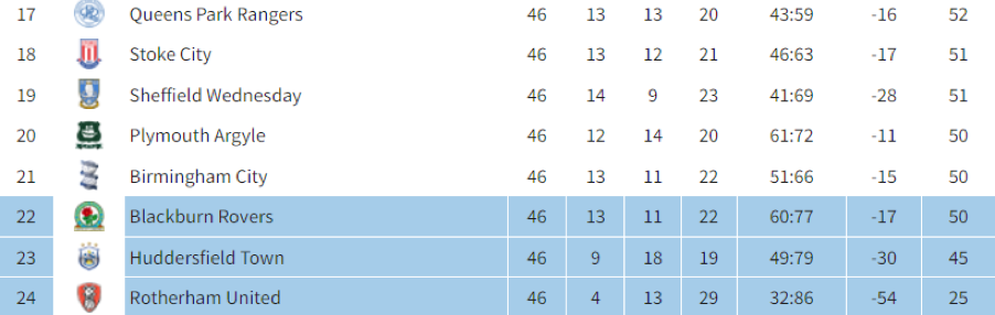 With two games remaining and seven teams still at risk of joining Rotherham in League One next season, the permutations at the bottom of the Championship are plentiful. Quite frankly, there are still so many different possibilities that, in order to do them justice, they would require an article of their own. That being said, wins for QPR and Stoke this weekend will guarantee their survival. A win for Blackburn would also put them in an incredibly strong position. By the same token, a defeat for Huddersfield against Birmingham would spell an end to their time in the Championship if Sheffield Wednesday got so much as a point against West Brom.