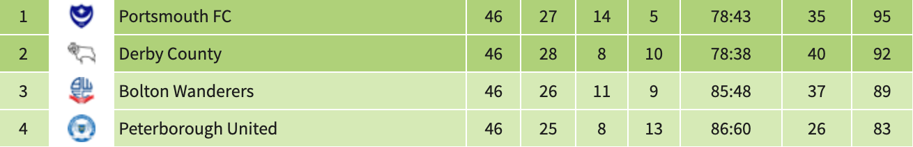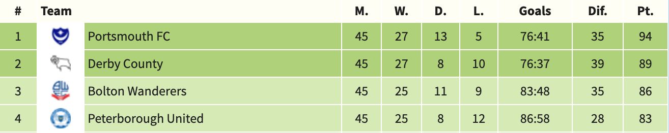 Surely we’re in the environs of stick-a-fork-in-it-because-it’s-done here, aren’t we? For Bolton to overtake Derby in a photo finish, they’d need to win by a couple of goals away at 4th-placed Peterborough while Derby lose by a couple of goals at home to rock-bottom Carlisle. No, that goose is cooked. Game over, man. Game over.