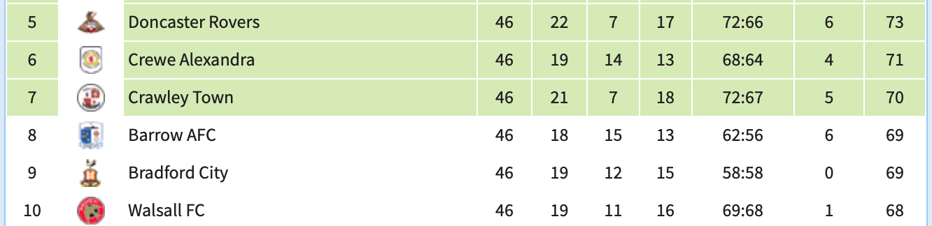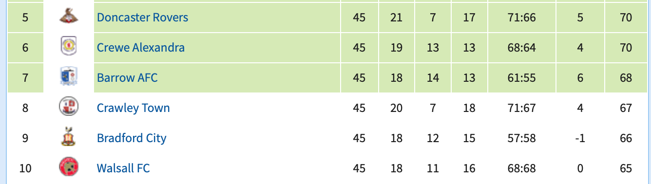 In short, yes. Walsall are relying on mass failure. I think they’ll manage a win against AFC Wimbledon, but it will almost certainly not be enough. Likewise, Bradford have left it a game too late — they’re rightly heavy-favourites to beat Newport; they’re rightly outsiders to make the play-offs. Because Donny will get a result. Crewe will play out the draw they need. And that leaves space for just one switcheroo.