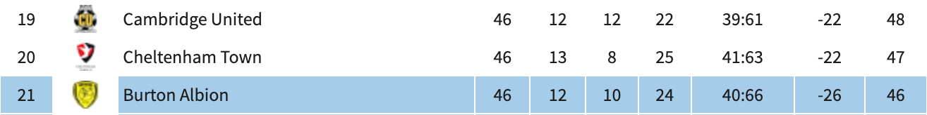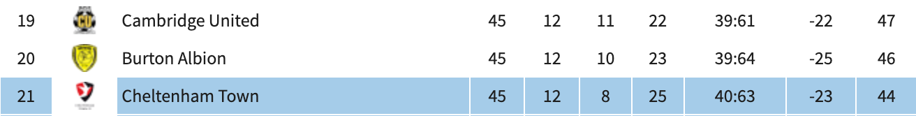 In Lynchian fashion, it all went wrong. Yet there may still be a happy ending, thanks to final-act triumphs over Burton Albion and Peterborough. And helping Cheltenham is the long-distance form of Burton and Cambridge (sorry for, uh, ‘relegating’ you both to minor characters in this). All that’s keeping Cambridge up as it stands is Easter weekend, which brought their only two wins since February 17th. Burton have also won only twice in that time – two clubs circling the drain while simultaneously keeping their heads above water, which suggests a very blocked drain.