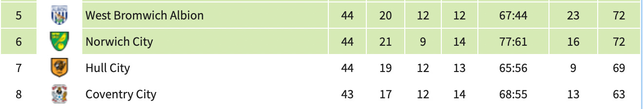 I hope we’re still talking about potential Play-Off shenanigans next week ahead of Final Day, but I suspect we won’t be. West Brom and Norwich may be more interested in jostling for 5th position and the privilege — if that is how it is seen — of playing Southampton rather than Ipswich, Leeds or Leicester.