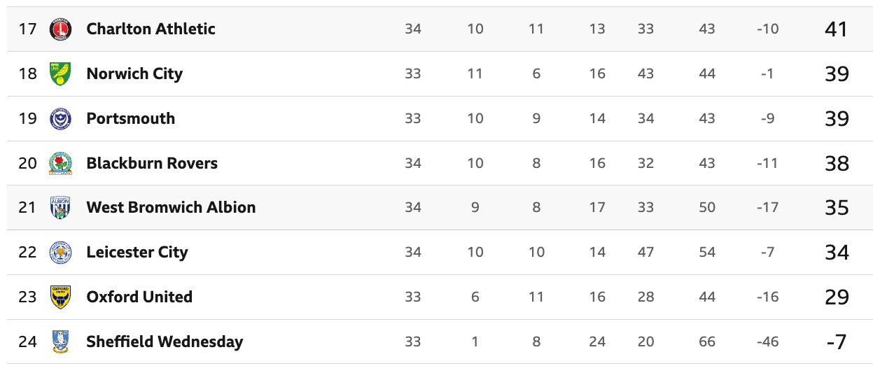 Thanks to a record of P8 W0 D4 L4 under Ramsay, West Bromwich Albion now sit just a point above the relegation zone. They’d be in it were it not for Leicester’s points deduction.