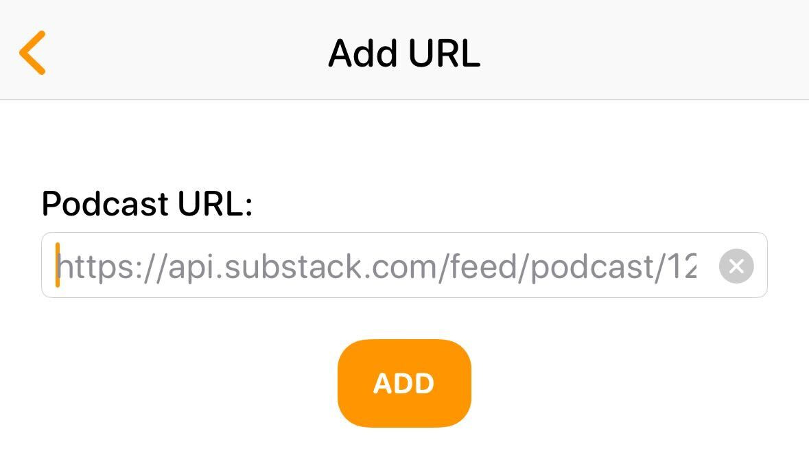Overcast: Click on the plus sign and tap Add URL. Enter the link that you copied from Substack.