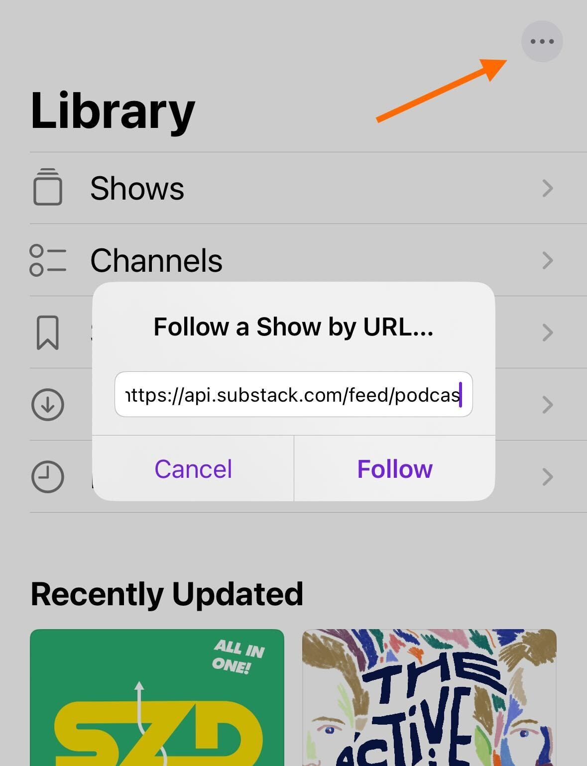 Apple Podcasts: Click on Library and the three dots in the top right corner. Select "Add a Show by URL" and enter the link you copied from Substack.