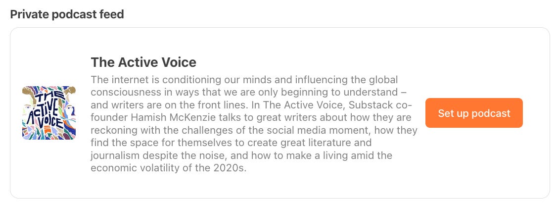 2. On your manage subscription page, scroll to the Private podcast feed section. Click "Set up podcast".