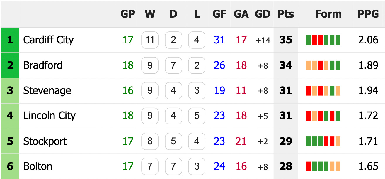 Between Cardiff and Stevenage in 2nd are Bradford City, who won in Plymouth on Saturday. A push in the back from Pleguezuelo, a tumble from Stephen Humphrys, a penalty scored by popular former Pilgrim Antoni Sarcevic — the sort of thing that happens in even games between a destitute side and one sitting pretty. 1-0 Bradford.