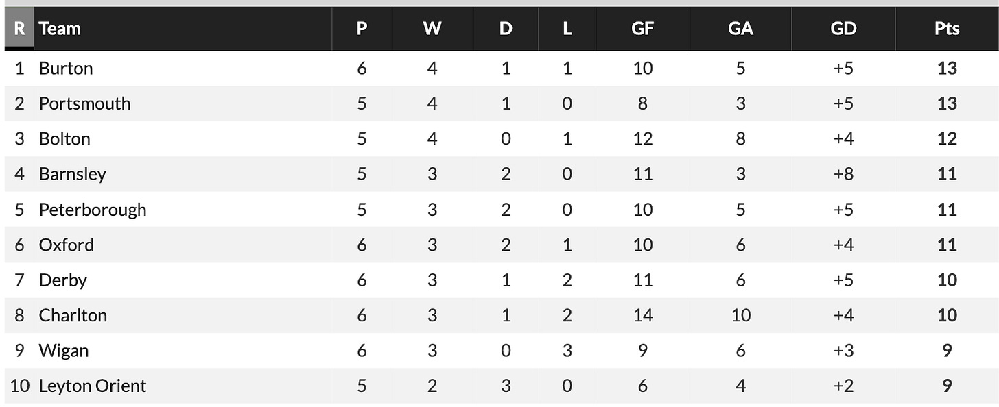 Bolton were almost perfect, but a 1-3 home defeat to Carlisle is a large blot on the copybook. Peterborough, Barnsley, Oxford, Derby and Charlton all picked up the level of points you would broadly expect from those looking to compete for promotion.