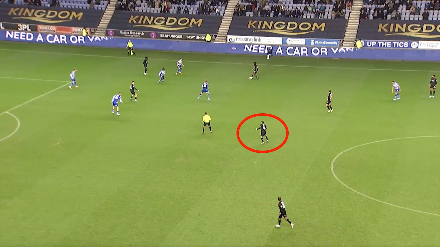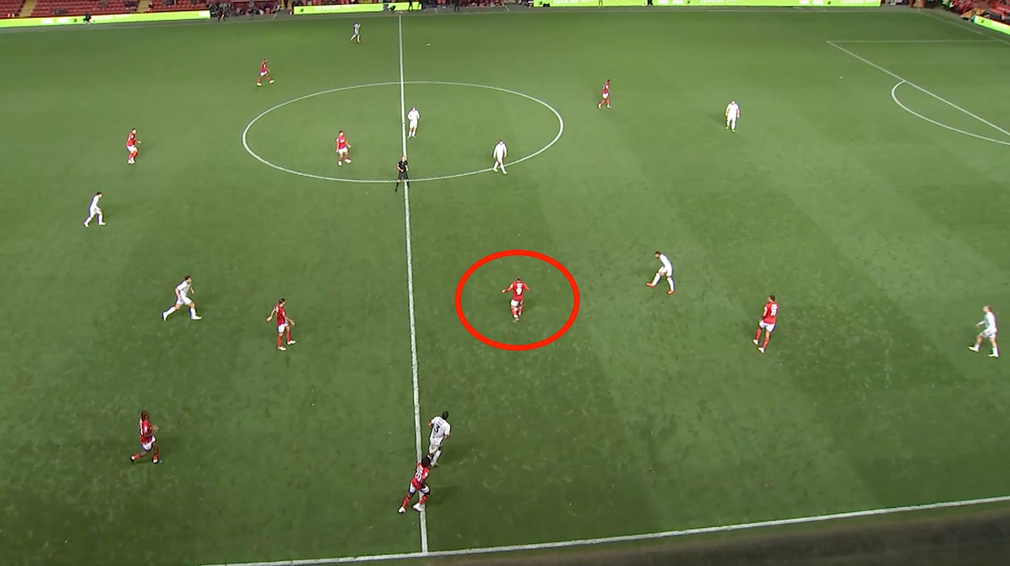 What stands out? Dean’s determination. His energy and movement. He presses relentlessly, puts himself about, wins fouls and constantly makes clever runs that make him a nuisance for defenders. Dean’s provenance makes energetic pressing entirely unsurprising: he scored on his PL2 debut in 2020, aged 16, when playing for a Leeds U23 side that mirrored Marcelo Bielsa’s senior team.