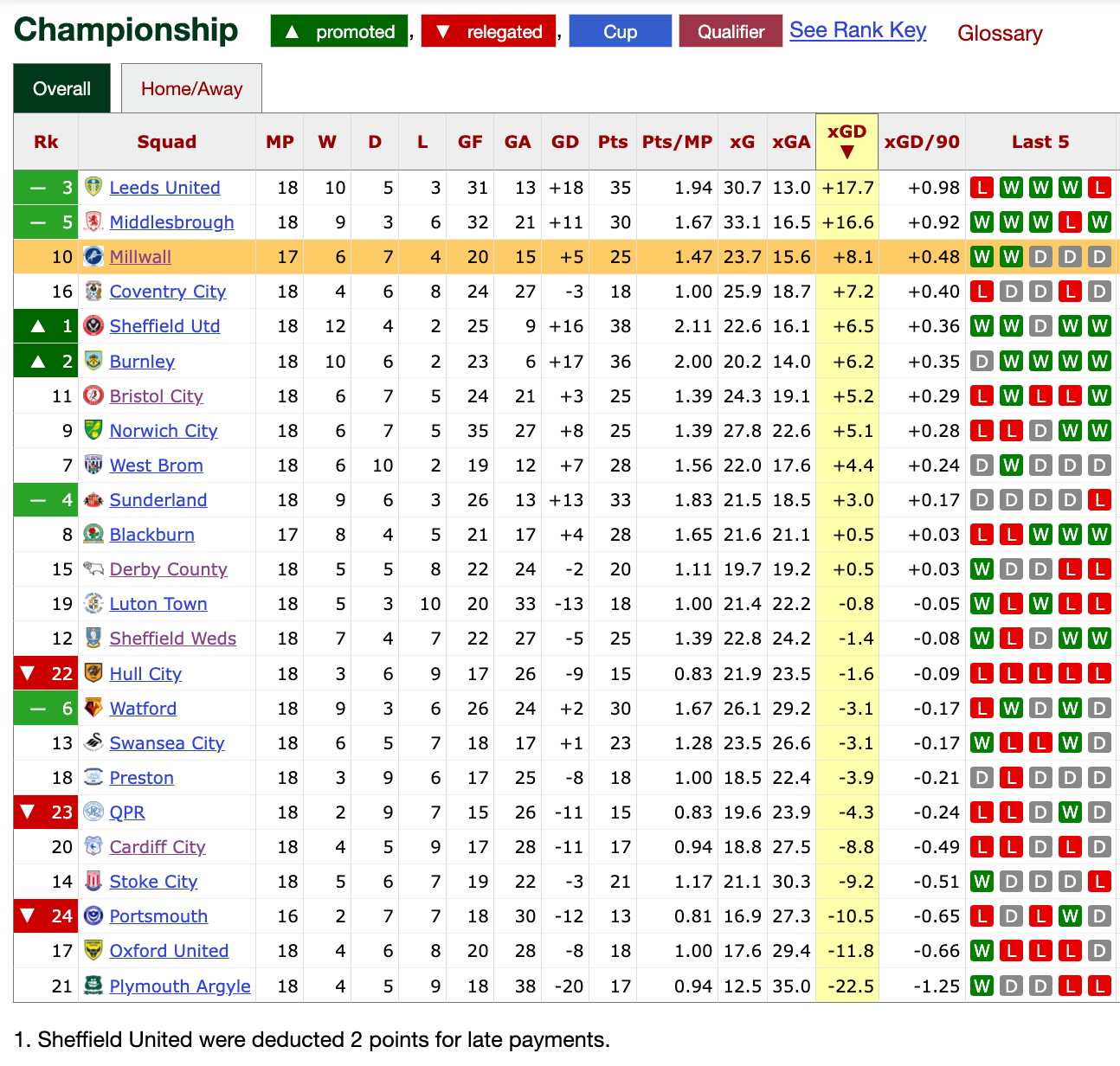 The Lions are less reliant than before on intangibles and tight margins. In fact, Macaulay Langstaff, Tom Bradshaw, Femi Azeez, George Honeyman and George Saville have collectively turned 10.2 non-penalty xG into just 3 goals. How often do you see Millwall at this end of an expected goals difference table?