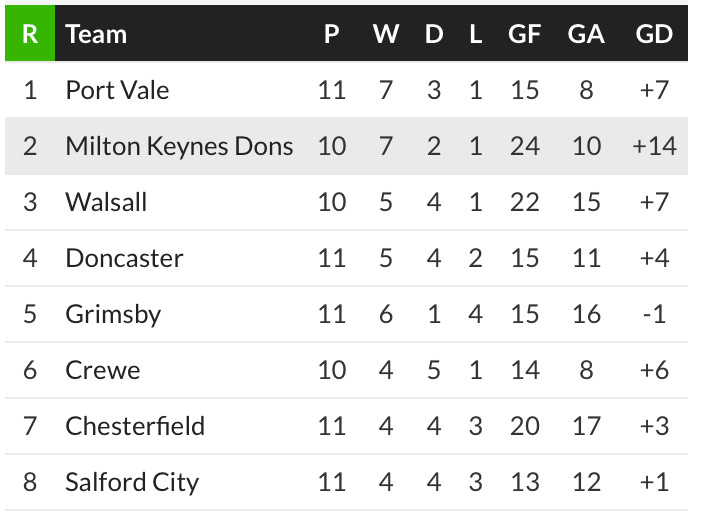 Having given their title rivals a head-start, MK have top spot in their sights. They’re now just five points behind the leaders, Port Vale, with a game in hand. Given the strength of their squad and their upturn in form since Scott Lindsey’s arrival, it isn’t a particularly bold statement to suggest that, if you finish above MK Dons, you’ll be playing League One football next season.