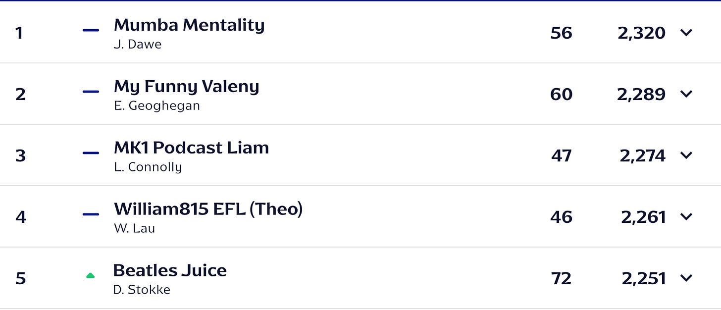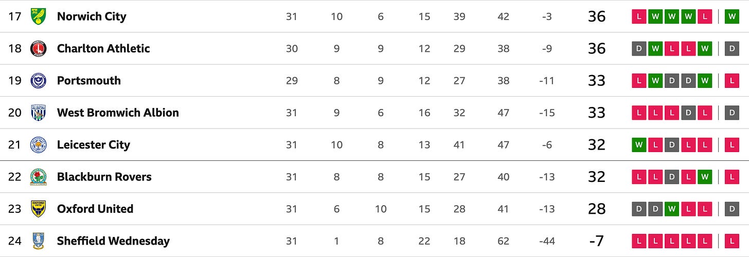 A strange weekend for Leicester City. Their potential points deduction had been referred to as such for so long that it started to become one of those phrases that lost all meaning. But no, it was real and it was a six-point deduction. Ostensibly bad… but maybe actually pretty good in the circumstances? It takes them to the edge of the relegation zone, so at least they now know what they’re playing for: survival from a double relegation.