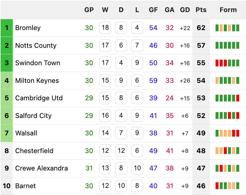Swindon were convincing winners against Oldham, with Aaron Drinan scoring his 24th goal of the season in all competitions, the third in a 3-0 victory. MK Dons were similarly dominant, even if the 3-2 scoreline against Cheltenham made it appear closer than it was. Goals at 2-0 just before the break and again at 3-1 late on flattered the visitors. League leaders Bromley nicked a late 2-1 win against Fleetwood to become the first side to pass 60 points.