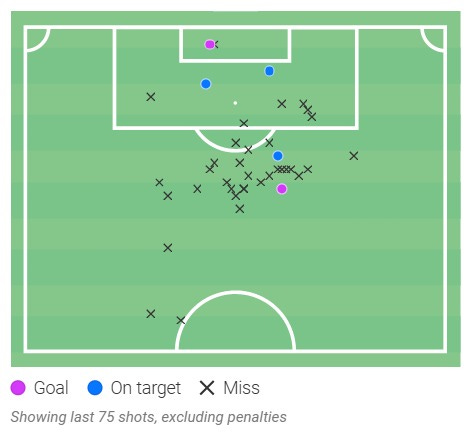 What it doesn't show you is the destination of each shot: half way line lobs that sail anywhere but goalward, volleys direct from corners that go out for throw-ins. Expect balls sailing out of the stadium, row Z getting peppered and probably the goal of the season award.