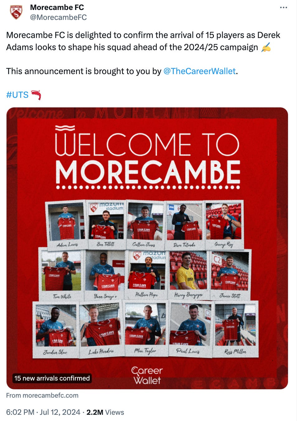 Look, announcing the signing of FIFTEEN players on a Friday at 6:02 pm is objectively fun, and we want to celebrate that. Morecambe have gone from recruiting zero players in the summer window to signing more than anyone else in League Two, so we’re going to focus on them before detailing the other EFL additions, because the situation matters.