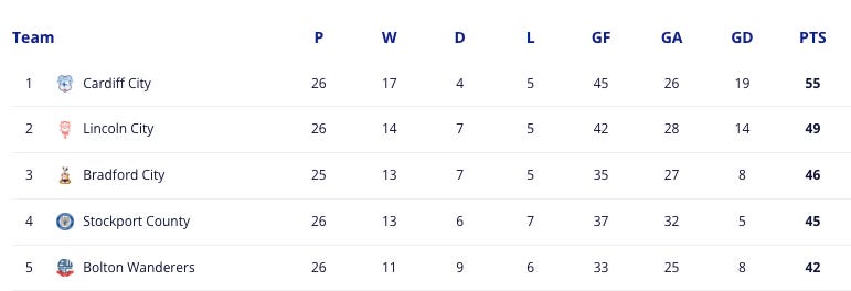 Finally, is it too early in the year for a Stag Party? Mansfield made it five wins in a row in all competitions by beating Port Vale 3-0. Spurs loanee Oliver Irow marked his senior debut by scoring twice either side of a Will Evans tap-in. Irow’s second goal in particular was certainly one that he won’t forget in a hurry. The Stags are up to 10th, but they’re only four points behind Huddersfield in 6th and they have not one, not two but three games in hand over the Terriers.