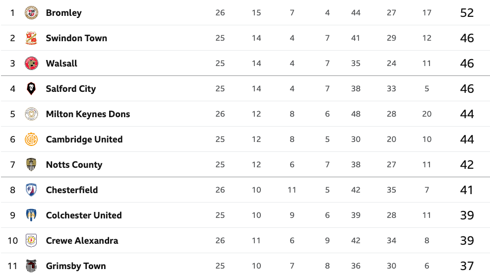 Salford finished the job to go level on points with Swindon in 2nd. They’re also six points off the top with a game in hand, thanks to Bromley drawing at Chesterfield in a 0-0 with plenty of goalmouth action. Bromley had an 89th-minute penalty to win it but Zach Hemmings saved from Nicke Kabamba. How significant could that end up being?