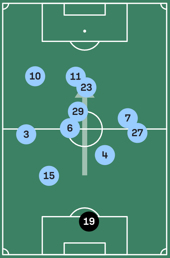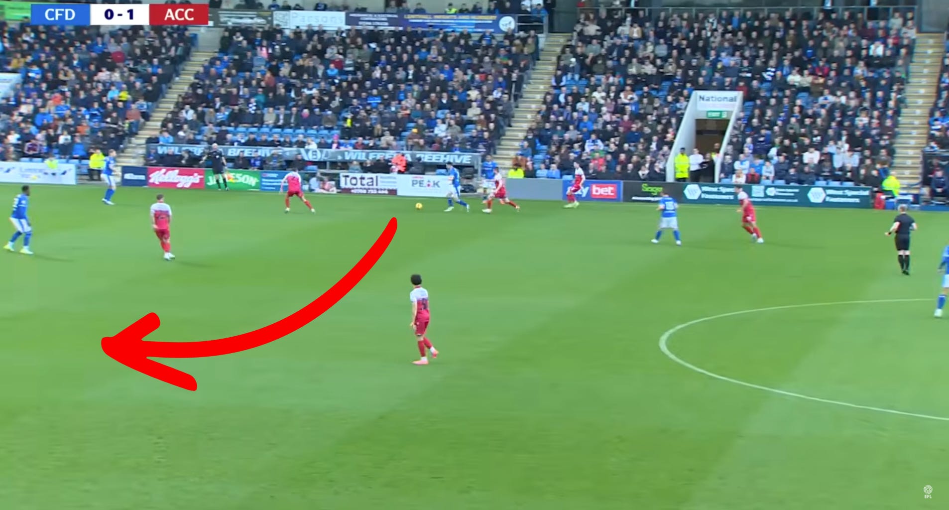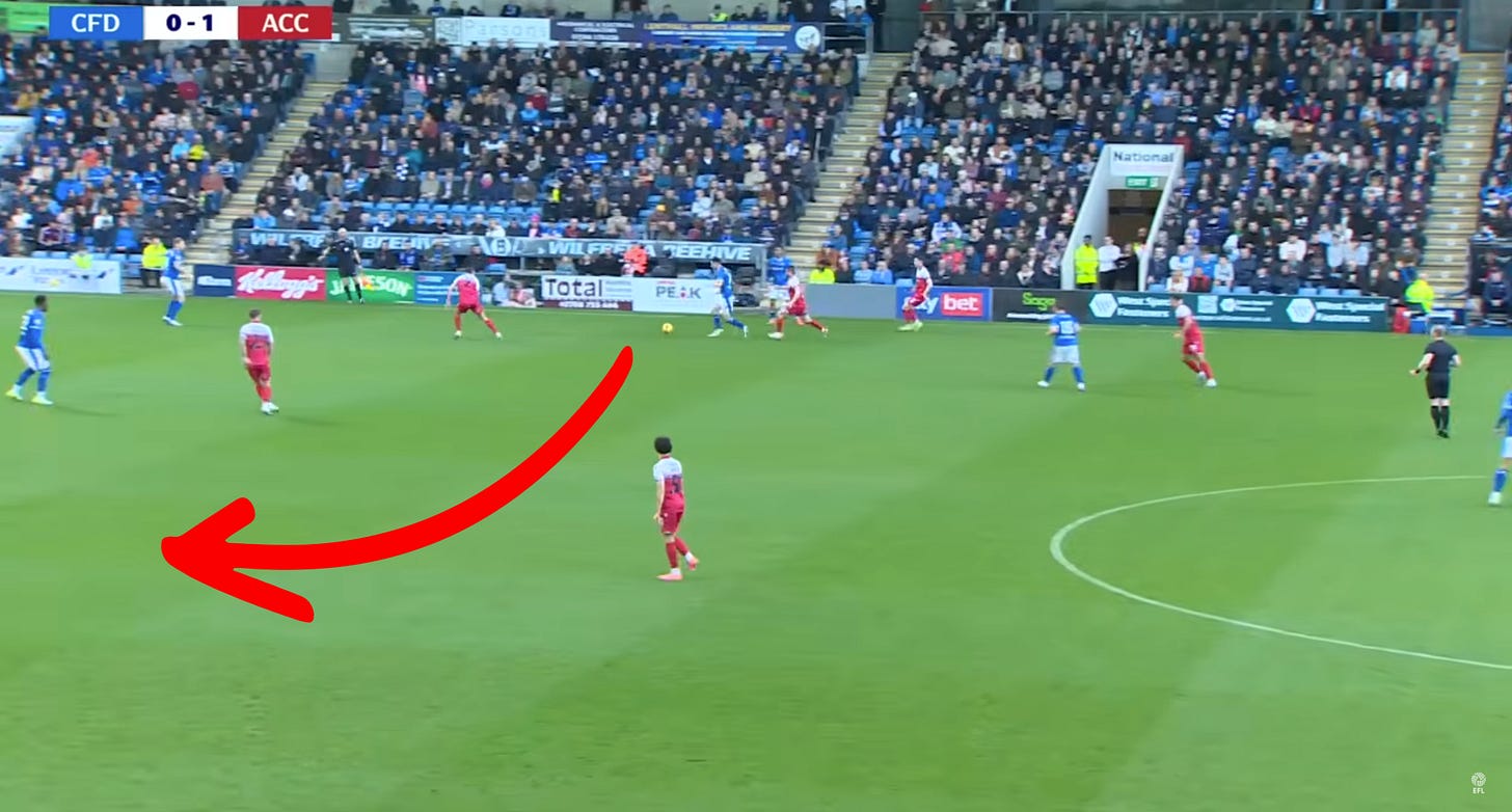 Third: Chesterfield v Accrington. Accy got their desserts, just. In a dreadful first half-hour, Chesterfield didn’t take a shot until the 30th minute, by which point they were 2–0 down to a Tyler Walton double – one, a lovely volley; the other, an easy header in the fallout from a corner that was provided by Liam Mandeville smashing the ball from this position [⤵️] towards his own goal. Bonkers!