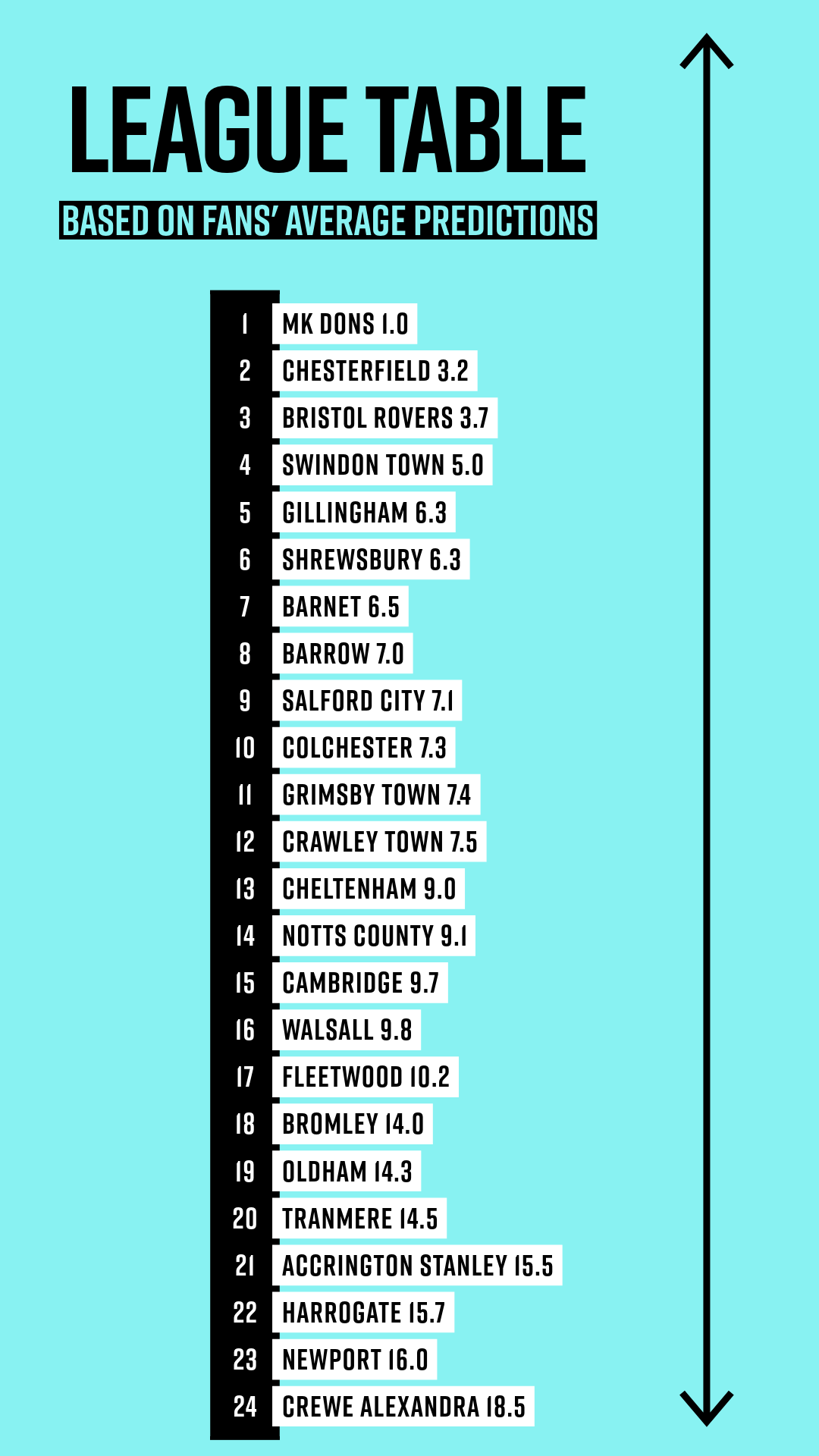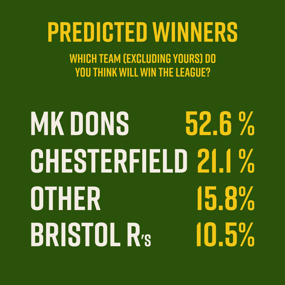 The answer was pretty conclusive: more people picked MK than didn’t. Their status as favourites with the fans (as opposed to fan favourites) reflects the bookies’ odds and general wider sentiment, as do Chesterfield’s contention credentials. A bit more surprising, perhaps, is that the fourth-most popular pick were Swindon. And thank you, too, to the person who voted for Crewe apparently with a straight face.