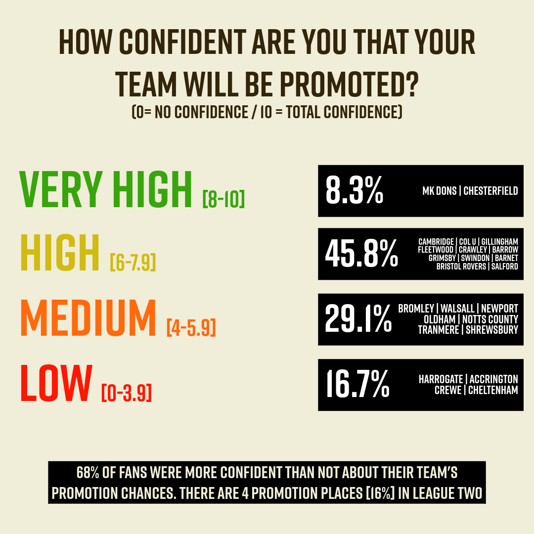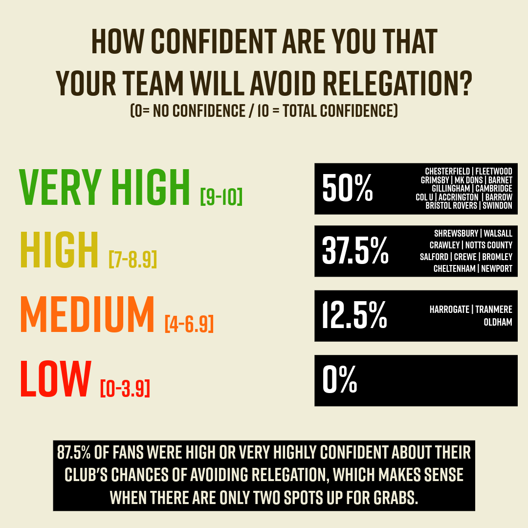 That 70/30 split may look naïve (you never think it’ll happen to you), but in fact, ‘only’ 7 of League Two’s 24 clubs changed their manager last season – it just seemed more chaotic than it was because Carlisle, MK Dons and Gillingham all changed theirs twice. This means that 70.8% of League Two managers were still in charge at the end of last season… and 70% of supporters think theirs will still be in charge at the end of this one. Touché.
