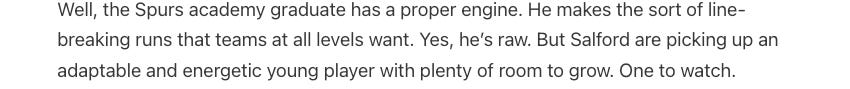 Between those two goals, Salford keeper Matthew Young saved a penalty, and not long after, Gills pulled one back through Josh Andrews’ lovely touch, turn and volley. It was 2-1 at half-time and stayed that way thanks largely to Adebola Oluwo’s second-half defending. Cesay, Young and Oluwo: three standout performers in back-to-back wins under Karl Robinson, who will be hoping for more green streaks and fewer red.