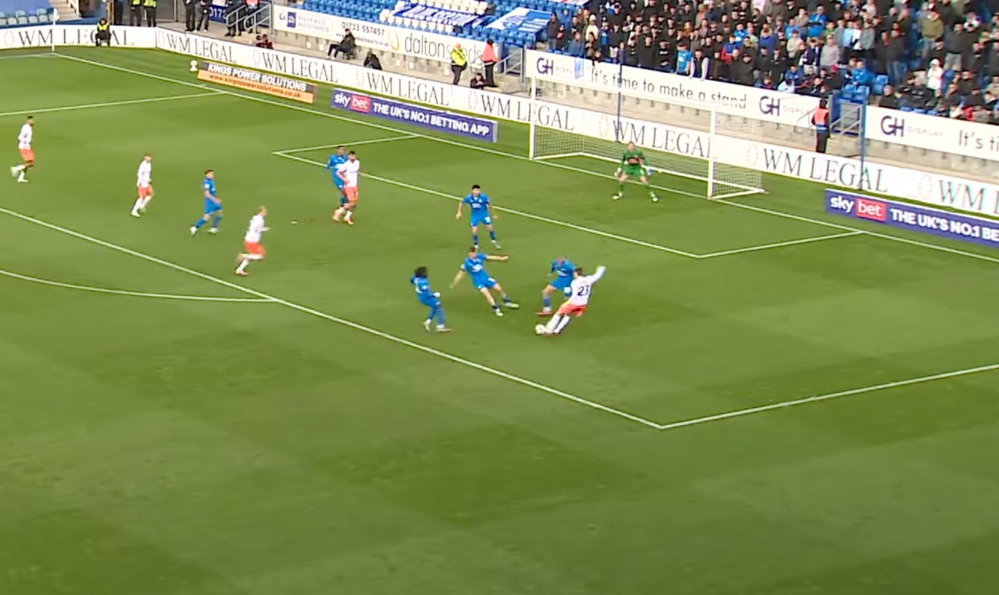 Peterborough had put in a decent performance but lost 2-1 at home to Blackpool, giving Ian Evatt a win in his first match managing the club he represented on some 250+ occasions. Their opener was farcical, the closer fantastic, as Scott Banks went full Mr Whippy for the Seasiders. Just look at the tiny gap between boots that Banks has to aim for here.