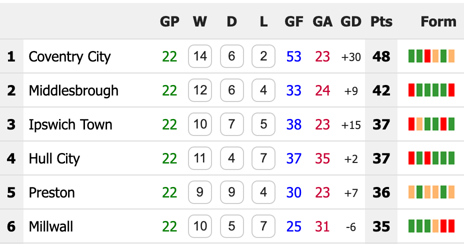 Yet Saints couldn’t fully capitalise. Although Nathan Wood soon equalised and Finn Azaz forced a decent save soon afterwards, Coventry restricted them to half-chances for the remaining 40 minutes, despite Gavin Bazunu going up for a corner at 1-1. The Sky Blues are 11 points clear of an ascending Ipswich in 3rd… but who’s this in 4th?