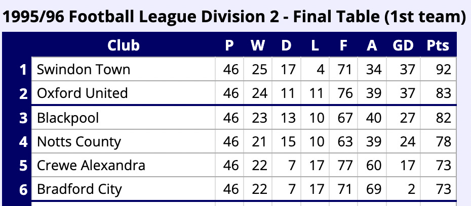How did it go in the Prem? Do you have to ask? Well, Glenn Hoddle left for Chelsea a few days later. Three years after that, he was managing England. And in the Premier League, Swindon finished bottom, conceding 100 goals – the most in a single season until Sheffield United came along in 2023/24.