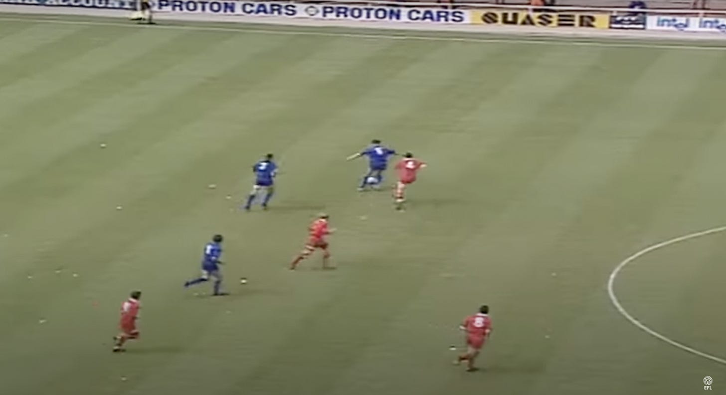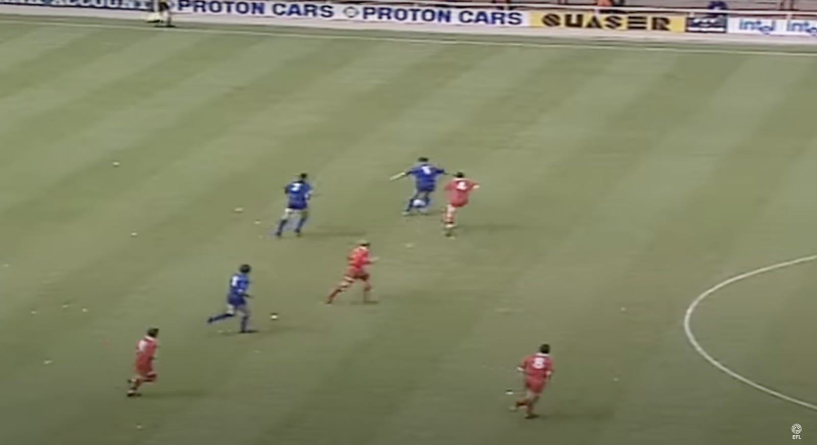 In this era of football, you would occasionally get a player who played either at centre-back OR as a striker. You don’t get that anymore, because of woke headers not being quite as important. But headers were important in 1993. And that’s why you see Steve Walsh, Leicester’s #5, playing up top – because Steve Walsh is good at headers.