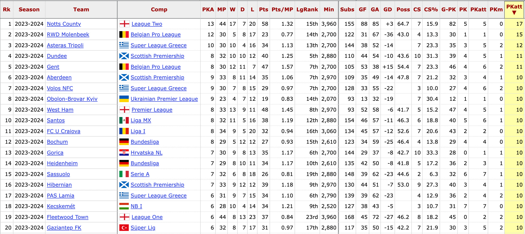 In some sort of wonky homage to Nottingham’s finest, Robin Hood, Notts have been clumsily charitable, stealing from themselves and giving to the… well, everyone else. Unsurprisingly, using Stathead, we can deduce that this is the most penalties conceded by any team playing in the 60+ leagues covered by FBref.com.