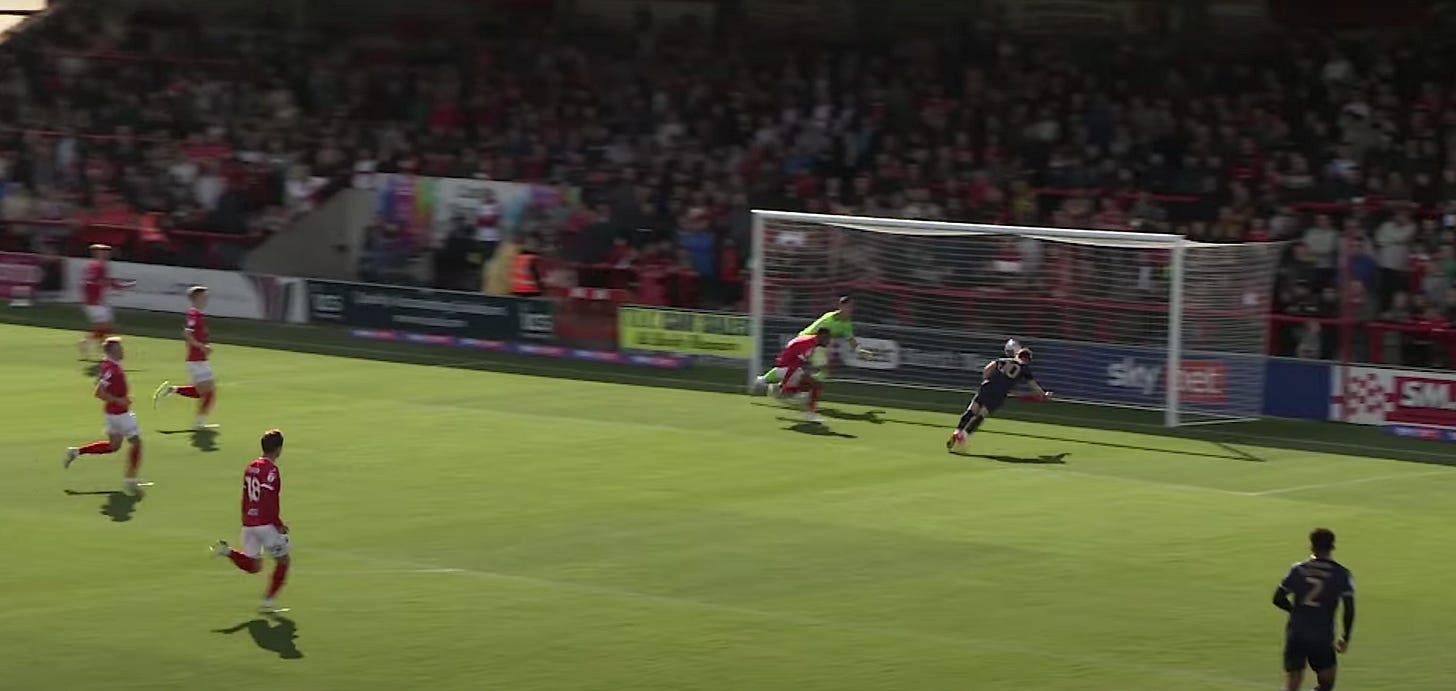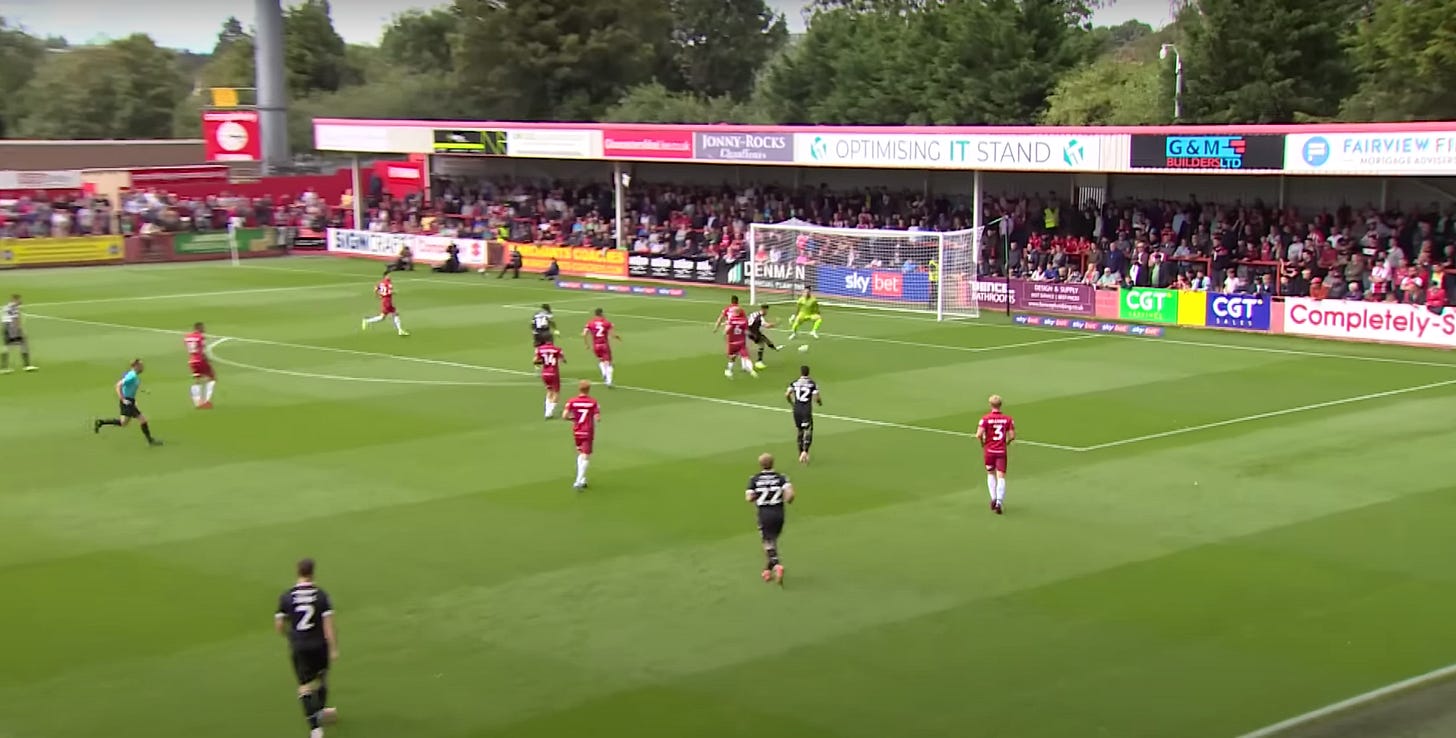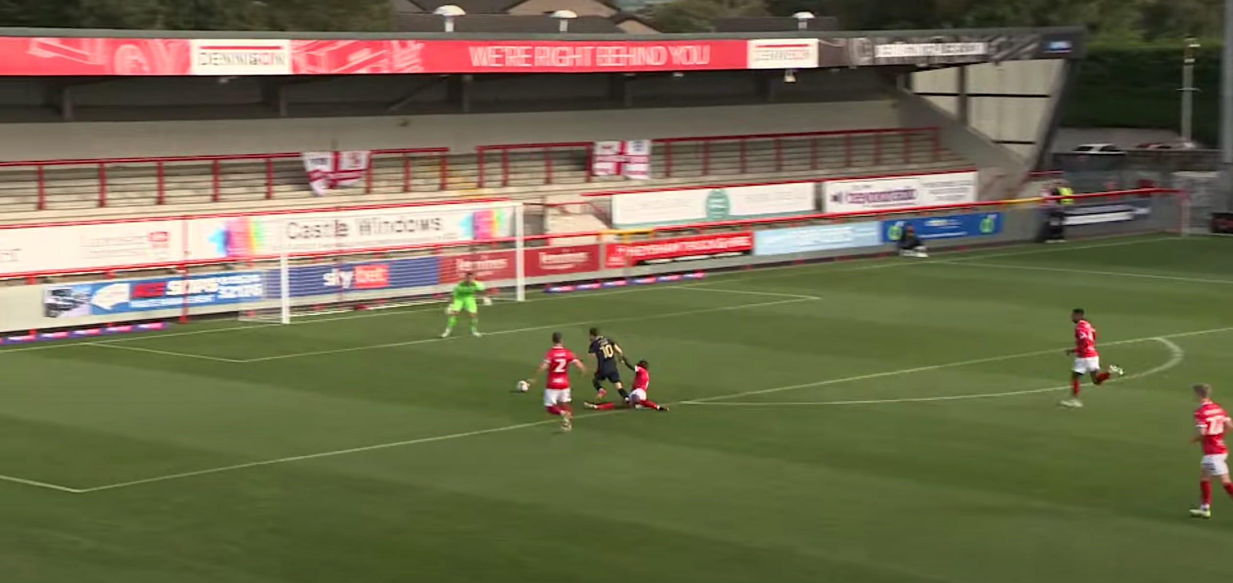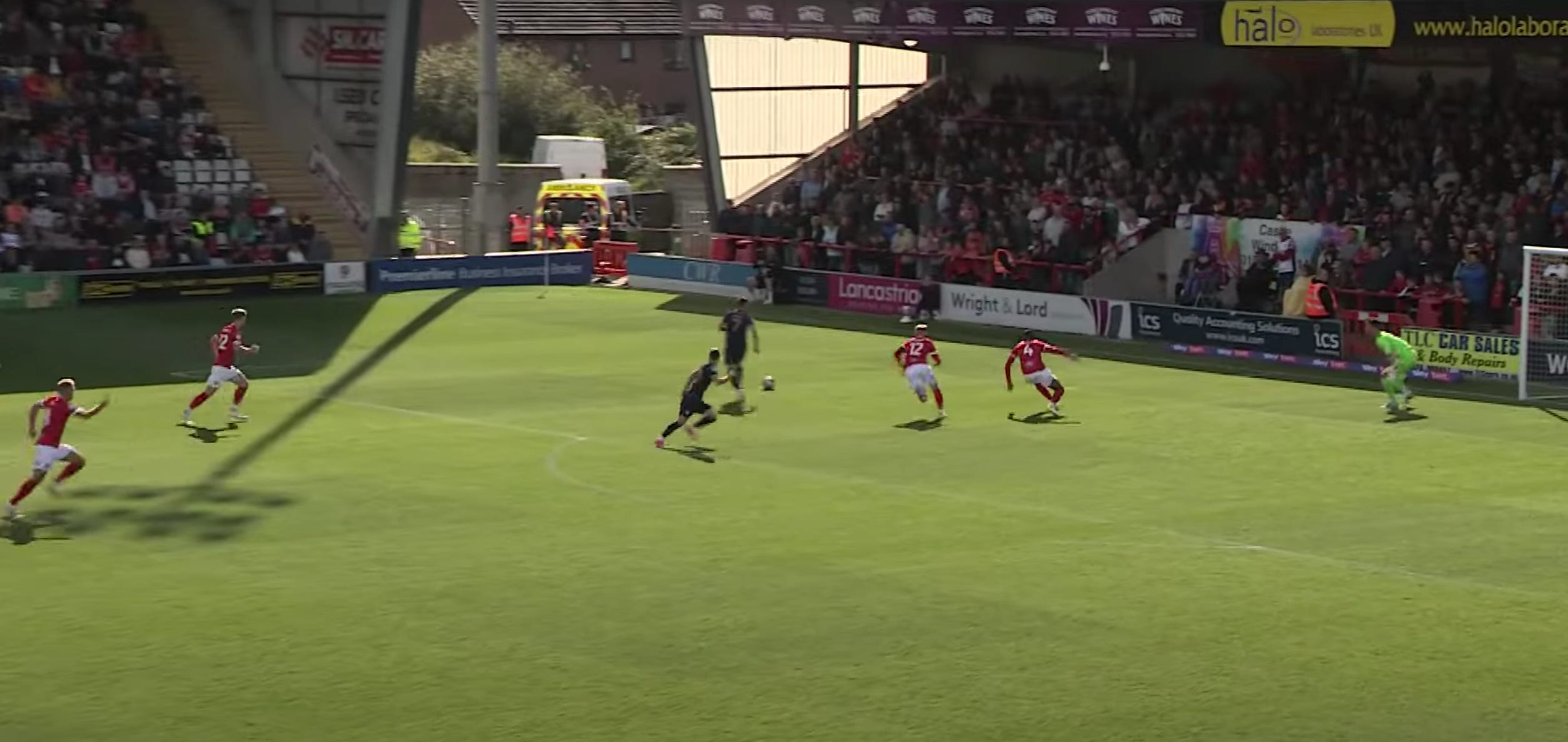 That was Young’s fourth assist for Kemp – the most prolific creator-to-goalscorer combination in League Two. Although their one-two against Crawley was probably the best of the lot, this latest goal showed their growing mutual understanding, because as two Morecambe players scramble to change direction, Kemp doesn’t wait for a cut-back past them – he’s on his way beyond them to the far post, where Young duly picks him out.