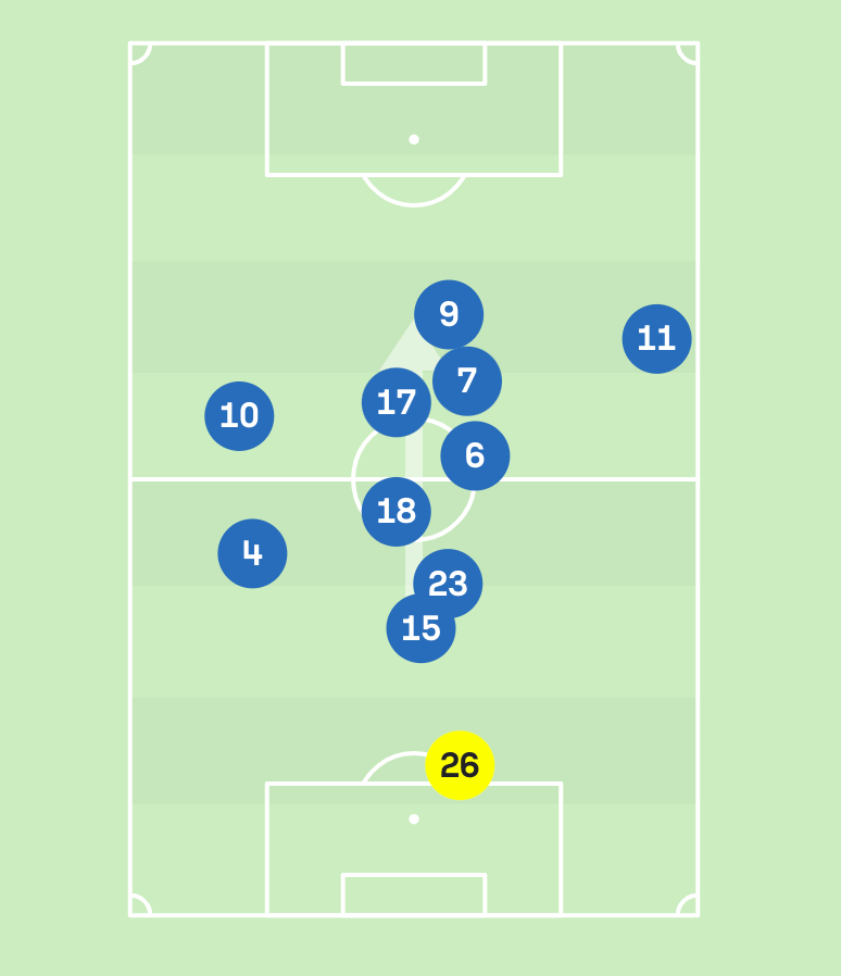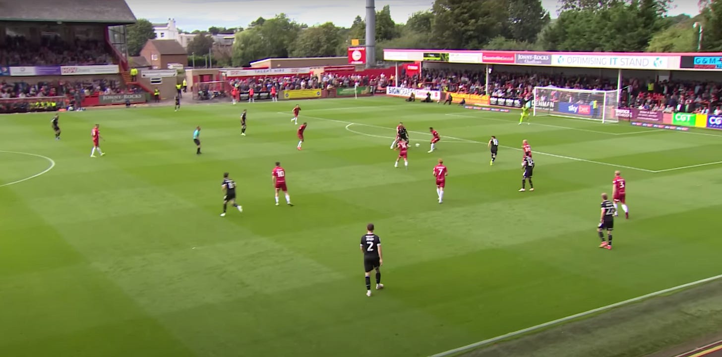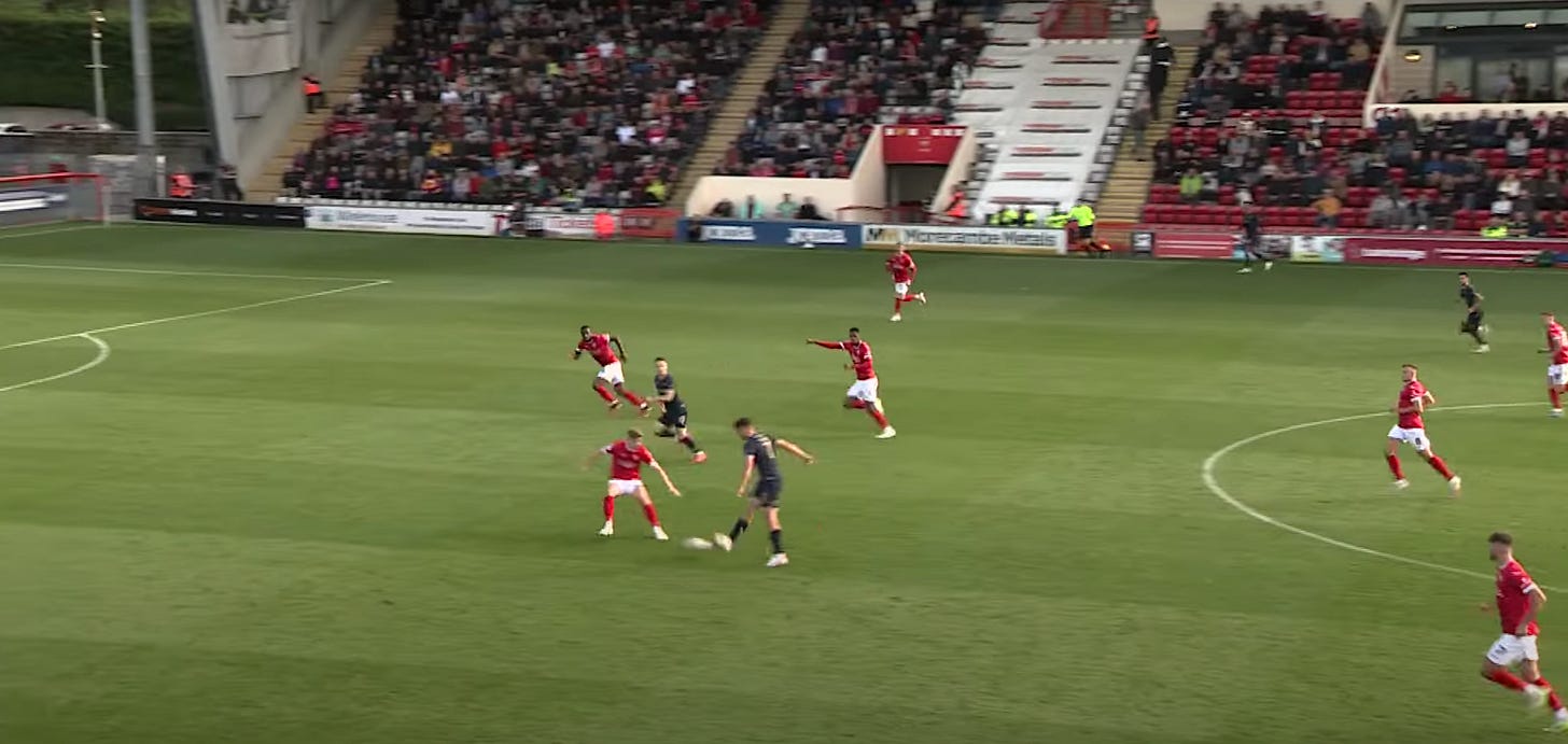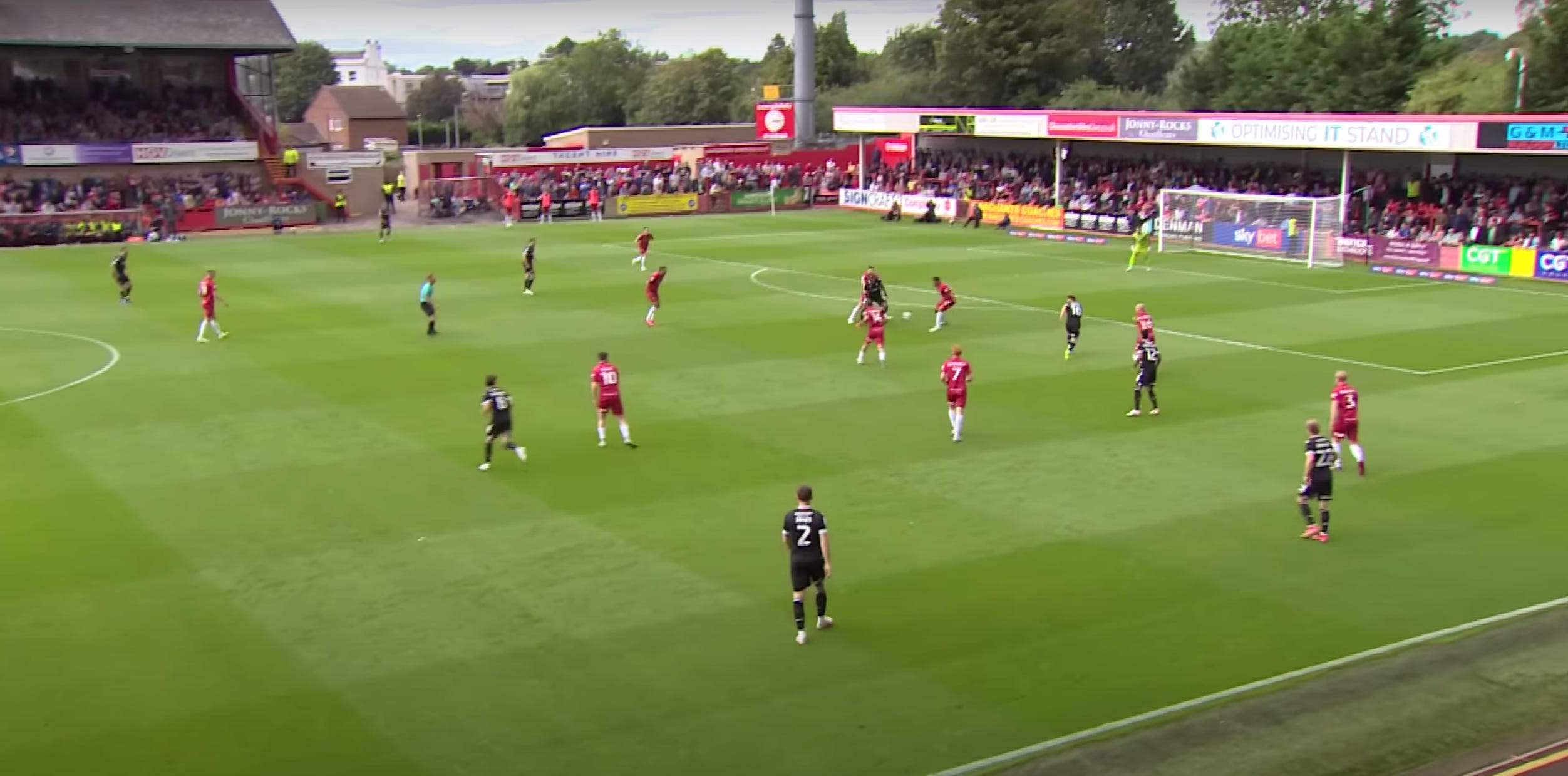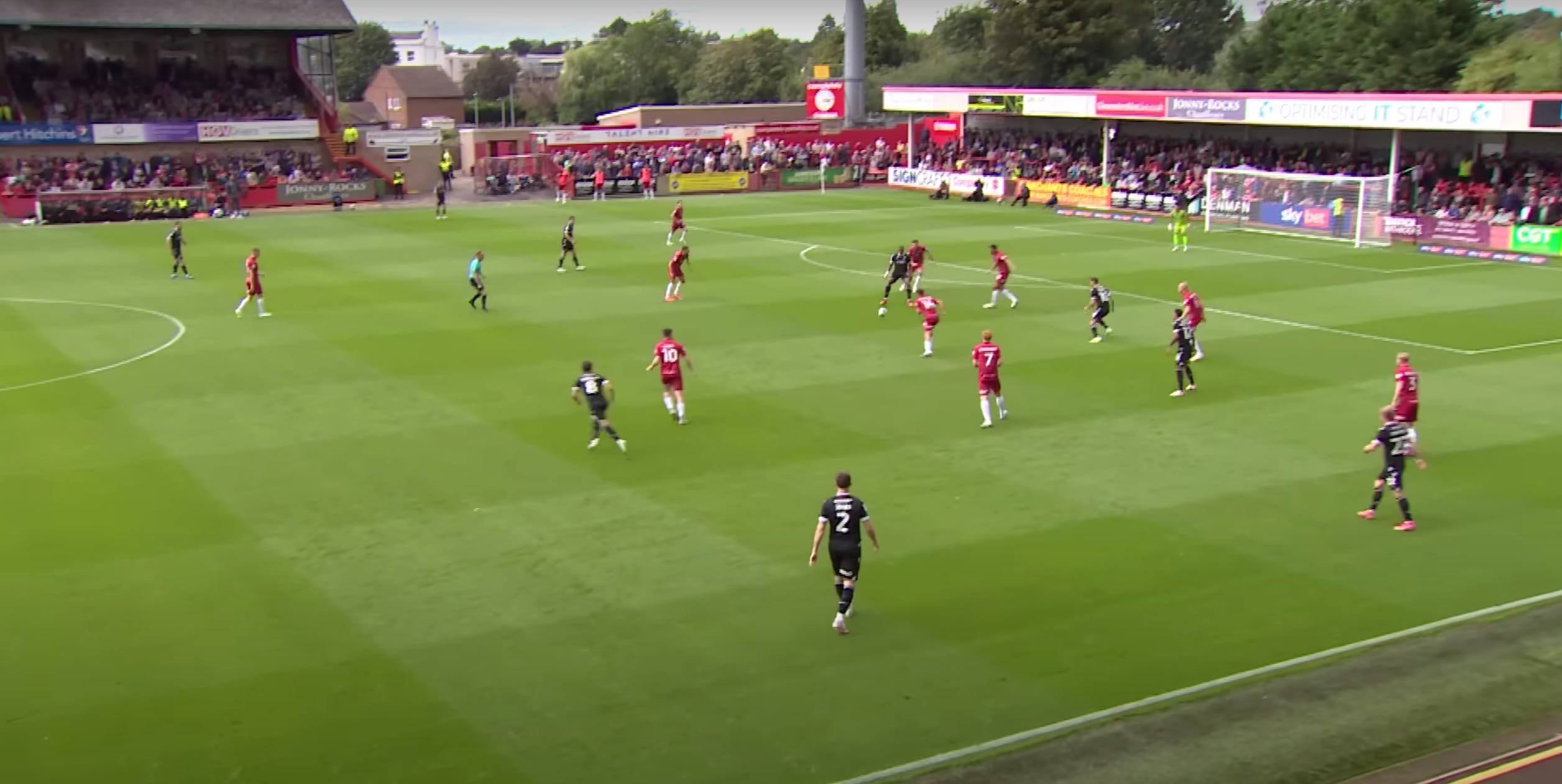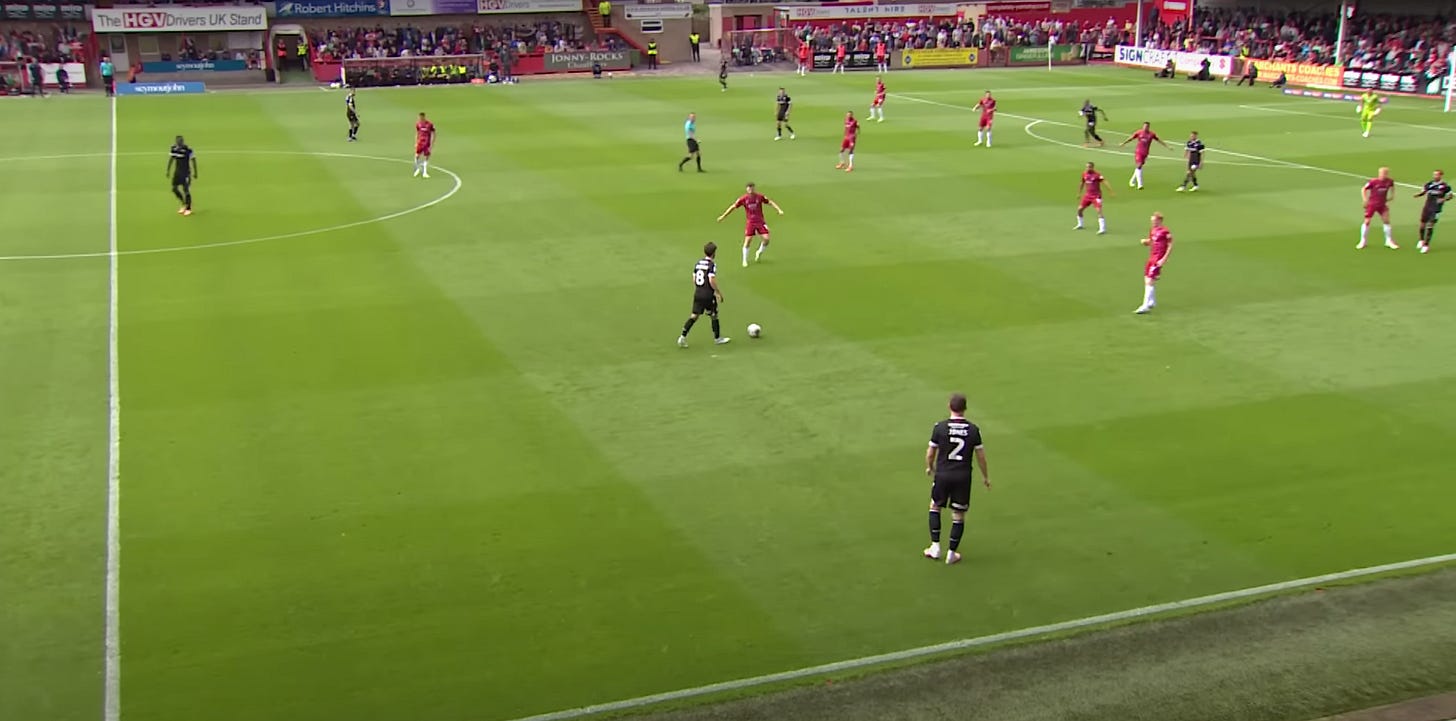 Williams’ setup requires composure and technical quality from his two midfielders, receiving the ball and recycling it quickly, because they’re operating in cramped spaces. With the exception of the two wide players, Notts County are so narrow in some games that their position map resembles more of a queue.
